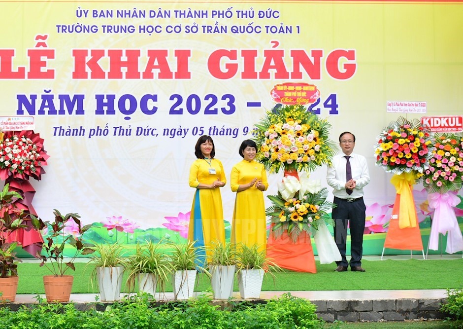 Tham dự lễ khai giảng tại Trường THCS Hoa Lư (phường Tăng Nhơn Phú B), đồng chí Nguyễn Hữu Hiệp, Ủy viên Ban Thường vụ Thành ủy TPHCM, Bí thư Thành ủy Thủ Đức đã tặng hoa chúc mừng, đánh giá cao những kết quả nổi bật, sự nỗ lực trong công tác dạy và học của tập thể cán bộ, giáo viên, học sinh nhà trường trong thời gian qua.